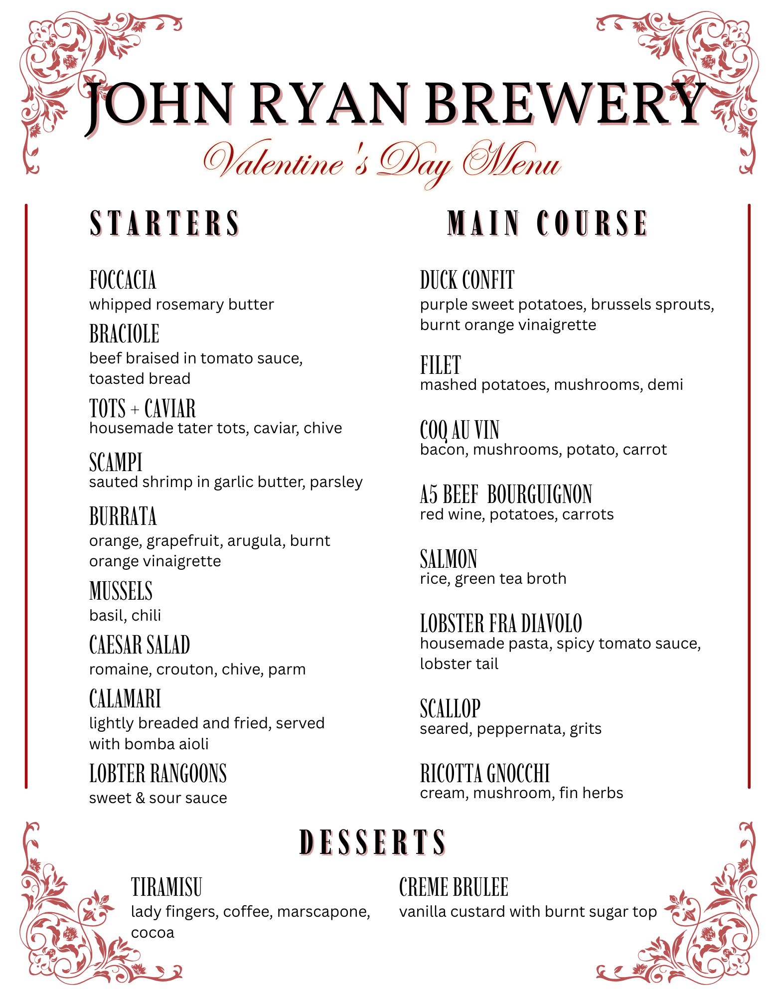Exclusive Valentine’s Day weekend menu below! The regular menu will NOT be available.